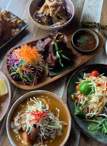 Char-grilled marinated lamb cutlets (four pieces) with Thai spices served with jaew sauce.